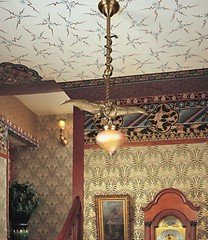 Дополнительными штрихами будут старинные ткани и вазы с цветами, а так же светильники, например старомодный потолочный светильник.