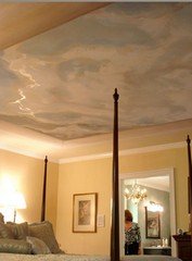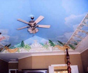 Это сложный процесс и требует определенных навыков,фон не должен быть слишком ярким, иначе потолок будет визуально делать комнату ниже.