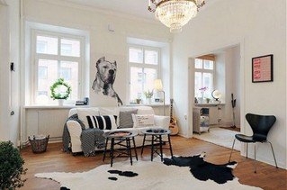 Можно сделать декоративный штрих с оригинальными коврами и ковриками из шкур, не зависимо от того где их расположить, под столом, посередине комнаты бросить шкуры на пол, а возможно даже украсить диван или кресло.