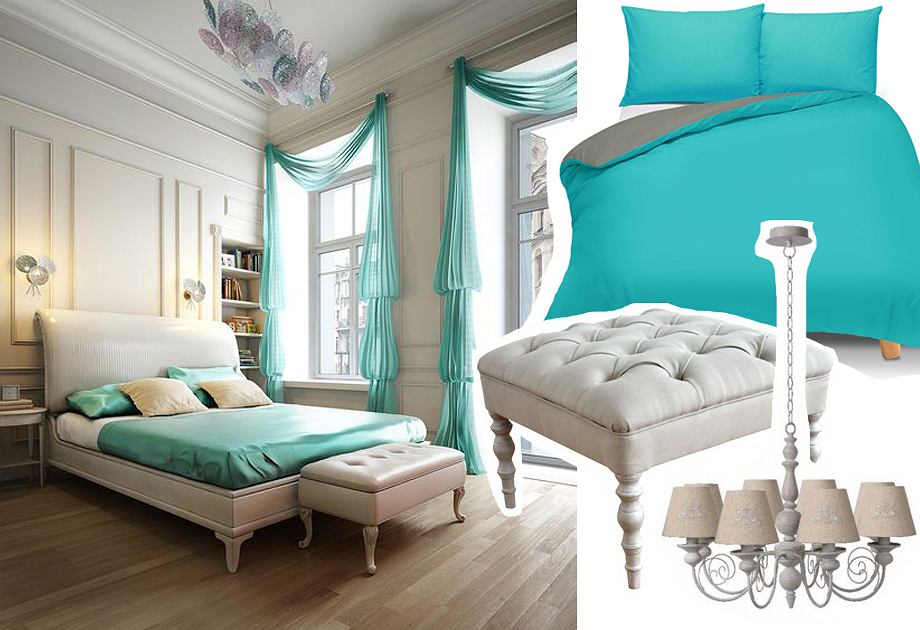 Перед кроватью поставьте подставку для ног в подобном стиле, а окна украсьте длинными шторами бирюзового цвета.