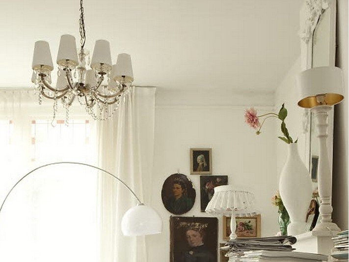 Тумбочка также является ключевым элементом, показывая формы, характерные для этого стиля и люстра довольно красива.