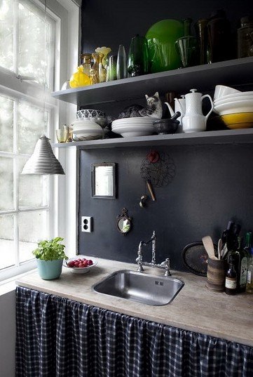Пол кухня украшен узорными маленькими плитками,на стене простые полки и шкафы для хранения.