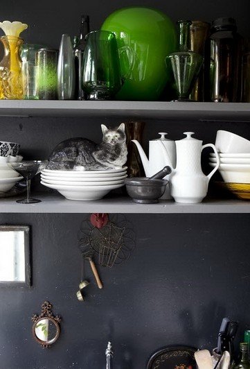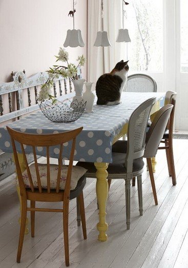 В столовой расположен деревянный стол с старинными ножками,покрытый скатертью и окруженный деревянными стульями, которые совершенно различной формы,а кошка просто дополнение.