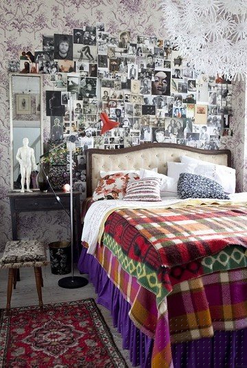 Спальня очень привлекательная и уютная,с традиционным ковром на полу.На стене традиционное обои,и кроме того,стена почти полностью покрыта коллажам из фотографий, которые можно увидеть и в гостиной.