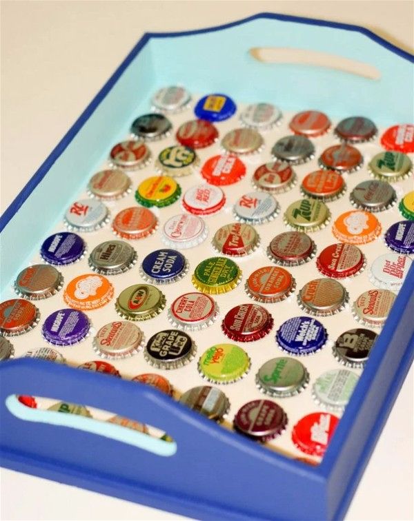 Если собирание различных крышек от газировки Ваша страсть, то этот проект точно Вас заинтересует. Накопленные годами крышечки с различными надписями рисунками смогут украсить и совершенно изменить вид обычного деревянного подноса, сделать его неповторимым. Скучный поднос из Икеи, украшенный таким образом, может стать интересным подарком близким людям. Он отлично подойдет для завтрака в постель или для размещения любимых предметов на журнальном столике.